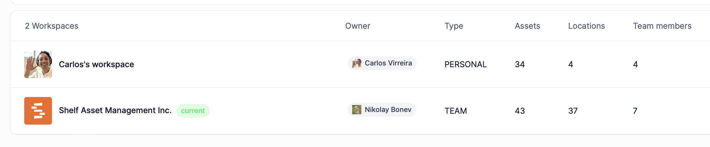 - Personal Workspace: Every Shelf user gets a personal workspace. It's the perfect place to track assets for personal collections or databases that don't require collaboration. You can even add "Non-registered team members" to assign custody of assets to, though these users can't be invited to your personal workspace.