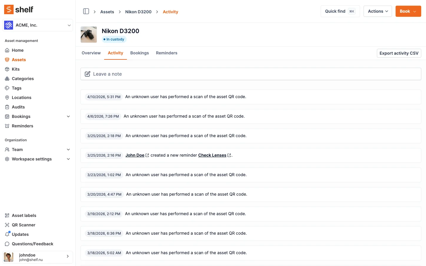 Every asset in Shelf gets its own dedicated page — a single source of truth that brings together everything you need to know about an item. Photos, custom fields, custody history, location, availability status, notes, and a printable QR label all live in one place. No more switching between spreadsheets, email threads, and shared drives to piece together asset information.