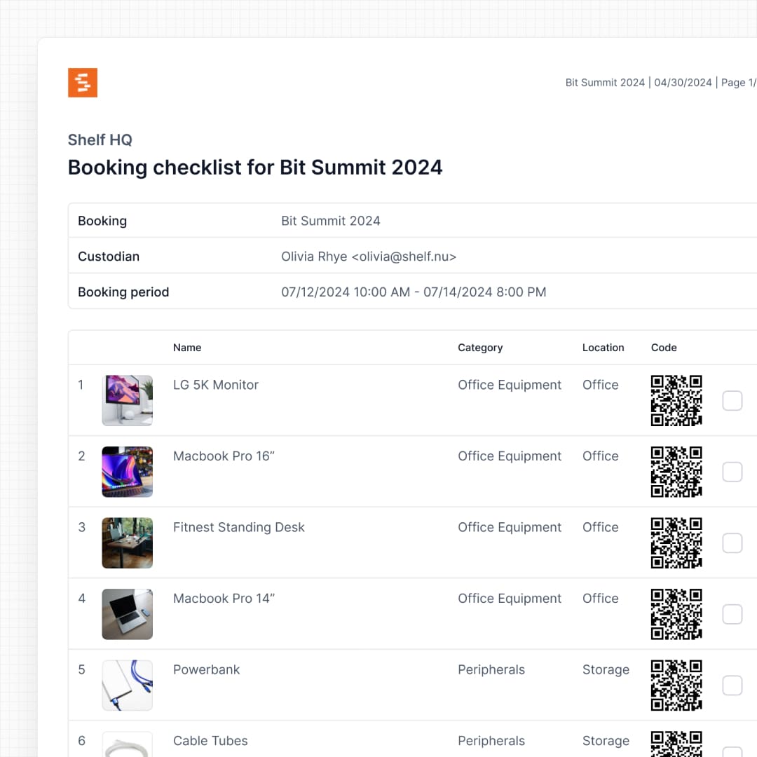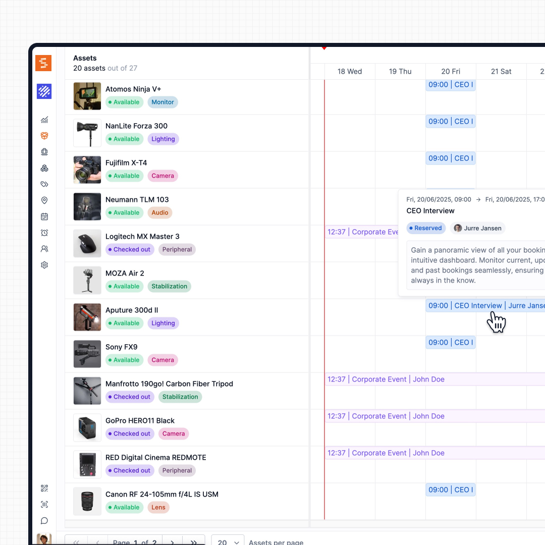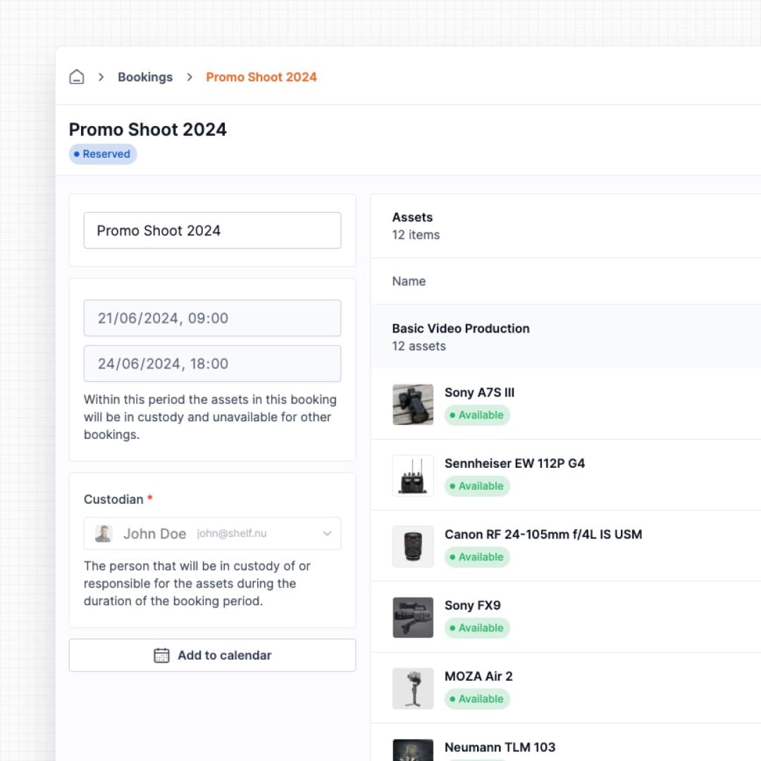 Bookings let teams reserve equipment ahead of time with conflict-free scheduling. Whether you're managing cameras, laptops, tools, or shared resources, Shelf ensures availability is clear and coordination is seamless.