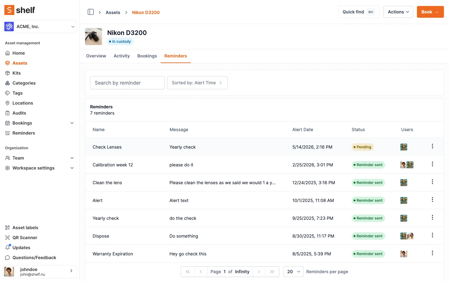 Shelf provides maintenance tracking through Asset Reminders and Custom Fields — configurable schedules, automatic team notifications, and service history attached to every asset. It is not a full CMMS (Computerized Maintenance Management System) with work orders, parts inventory, and technician dispatching. It is the maintenance layer that 80% of equipment teams actually need: know what is due, get notified, document what was done.